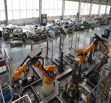 Case highlights: 1. Renovation of existing fixtures with low cost and short cycle; 2. There are many types of flexible switching of fixtures, automatic switching of various welding tongs, 4 robots and one master control station, 27 sets of fixtures, and 16 stations.